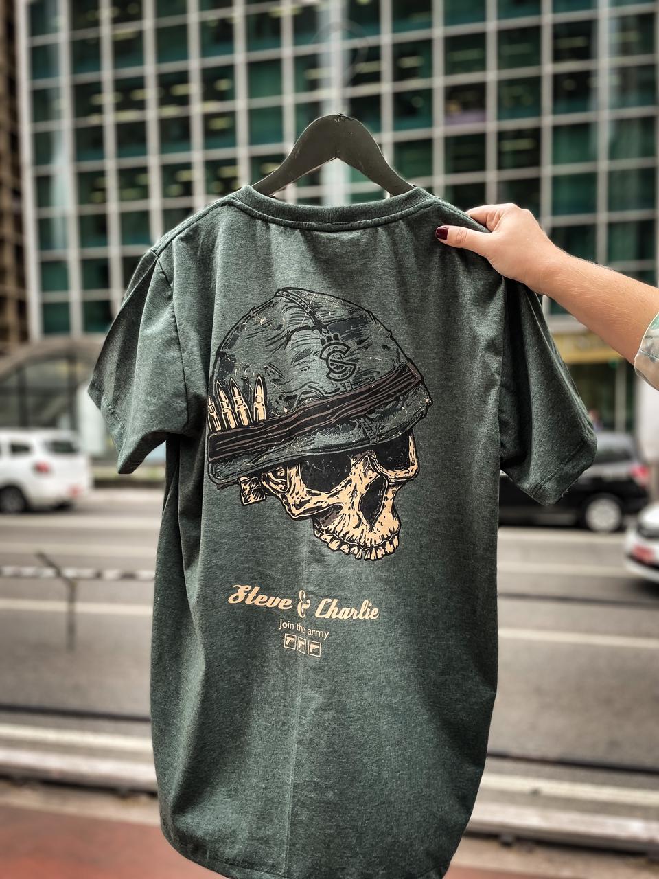 Camiseta Masculina Steve & Charlie Caveira. A camiseta possui um toque macio, uma estampa aplicada em serigrafia nas costas e na parte superior frontal, mangas curtas, decote redondo e barra reta. Feita em malha 100% algodão 30/1 fio penteado e cor verde exército.