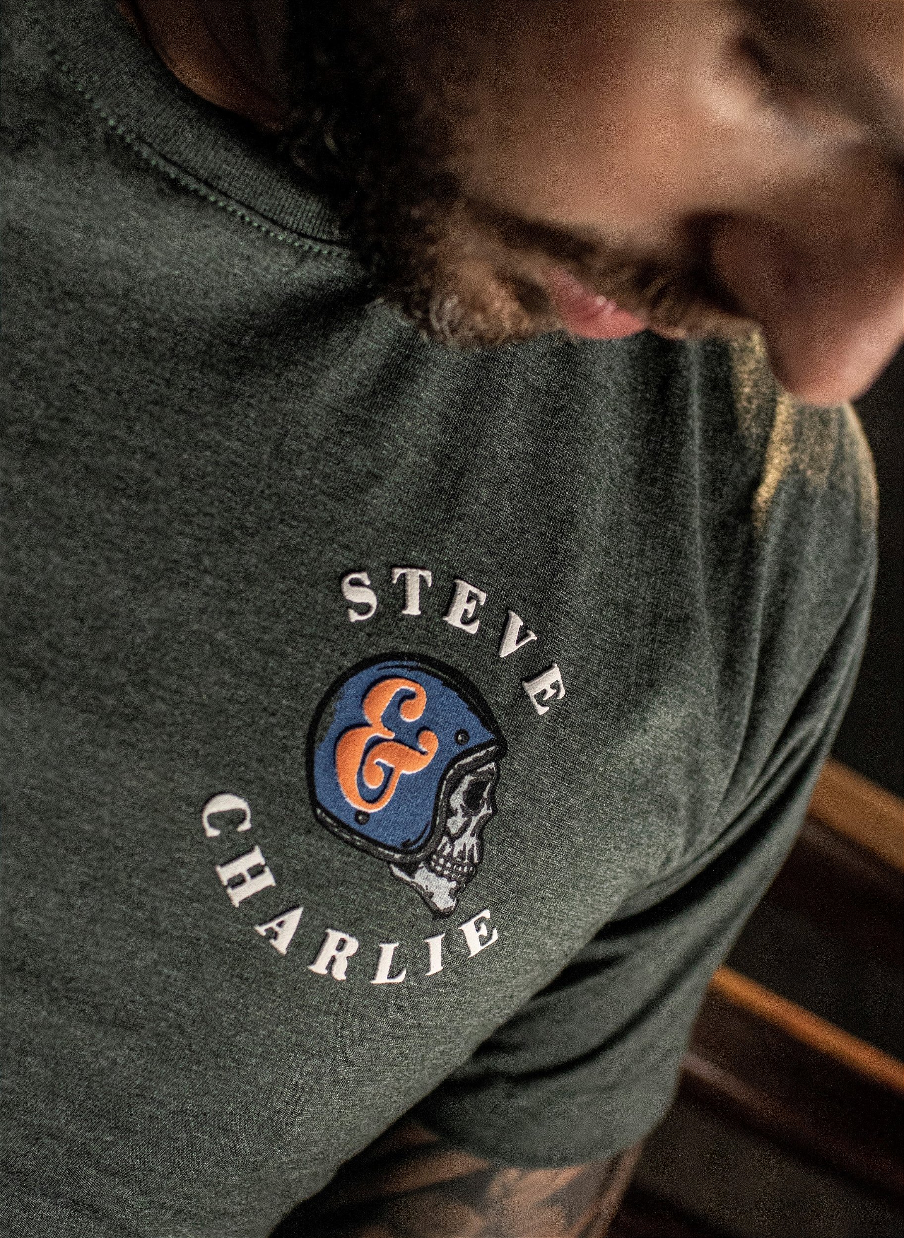 Camiseta Masculina Steve & Charlie Café Racer. . A camiseta possui uma estampa aplicada em serigrafia e alto-relevo, mangas curtas, decote redondo e barra reta. É na cor verde exército, feita em 100% algodão 30/1 fio penteado.