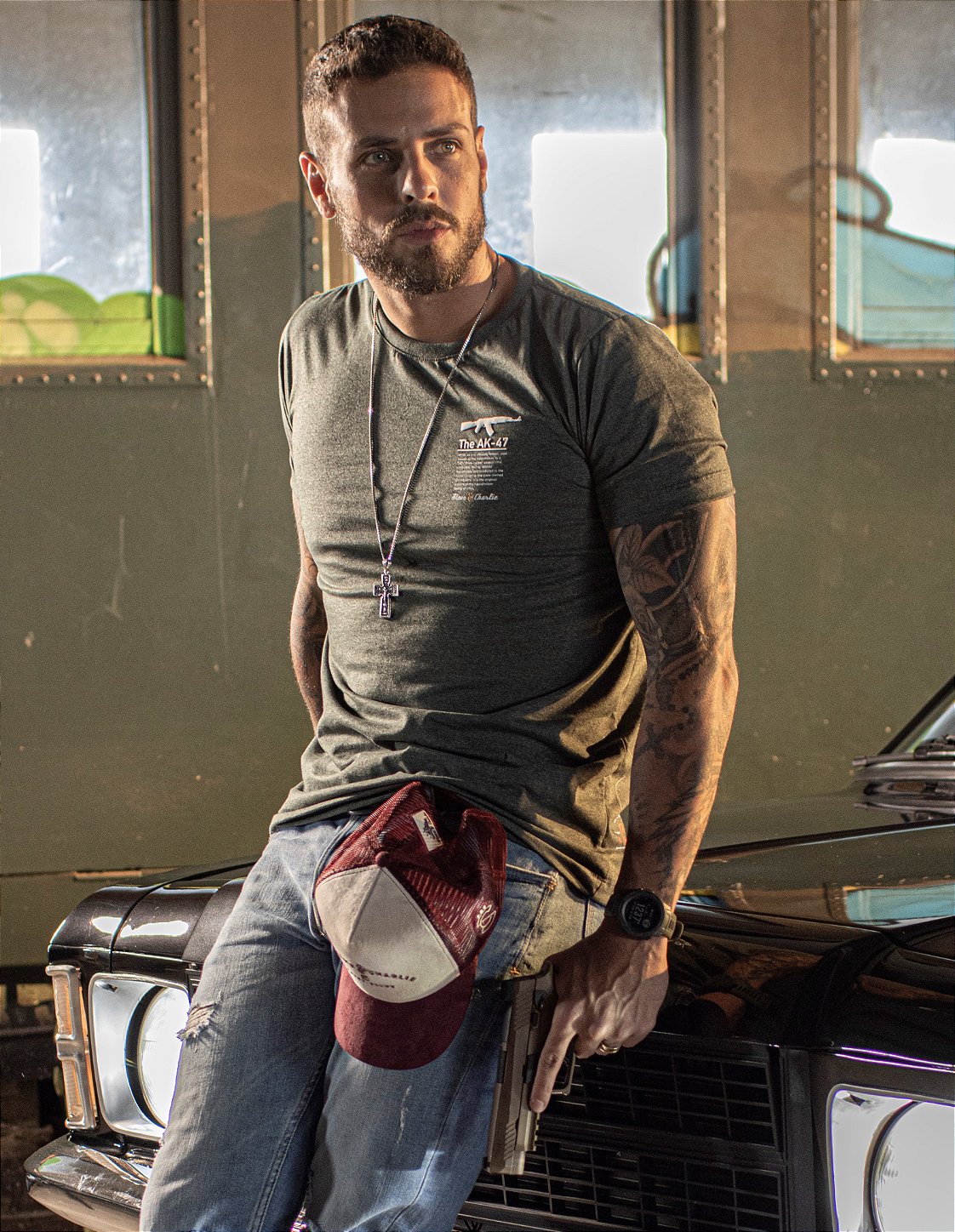 Camiseta Masculina Steve & Charlie Kalashnikov. A camiseta possui um toque macio, uma estampa aplicada em serigrafia nas costas e alto-relevo no parte superior frontal, mangas curtas, decote redondo e barra reta. Feita em malha 100% algodão 30/1 fio penteado e cor verde exército.