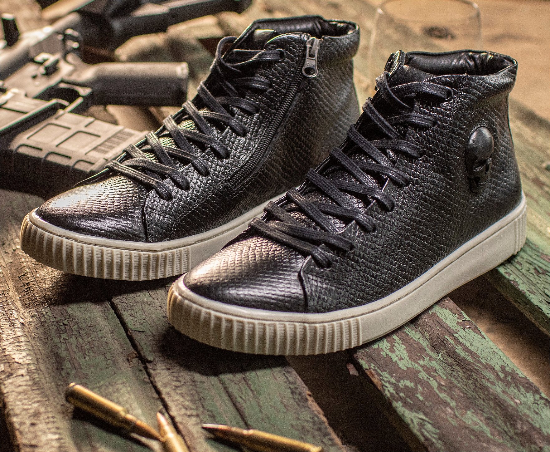 Tênis da Linha Steve & Charlie Black Skull com estampa Snake, feito de material nobre com brilho escovado, possui detalhe em caveira na lateral, é leve e macio, um tênis extremamente confortável para você que deseja expressar seu estilo de vida através da moda.